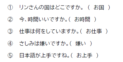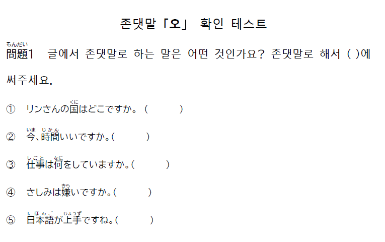 중급 학습자를 위해, 「존경어의 お」 사용법을 복습할 수 있는 연습 문제를 준비했습니다. 인쇄해서 사용할 수도 있습니다.