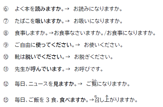 メモ①:「お+ます形+になります」と「お+ます形+なさいます」は、どちらを使っても同じ意味です。3グルールの動詞には、「お+ます形+なさいます」を使う方が使いやすいです。